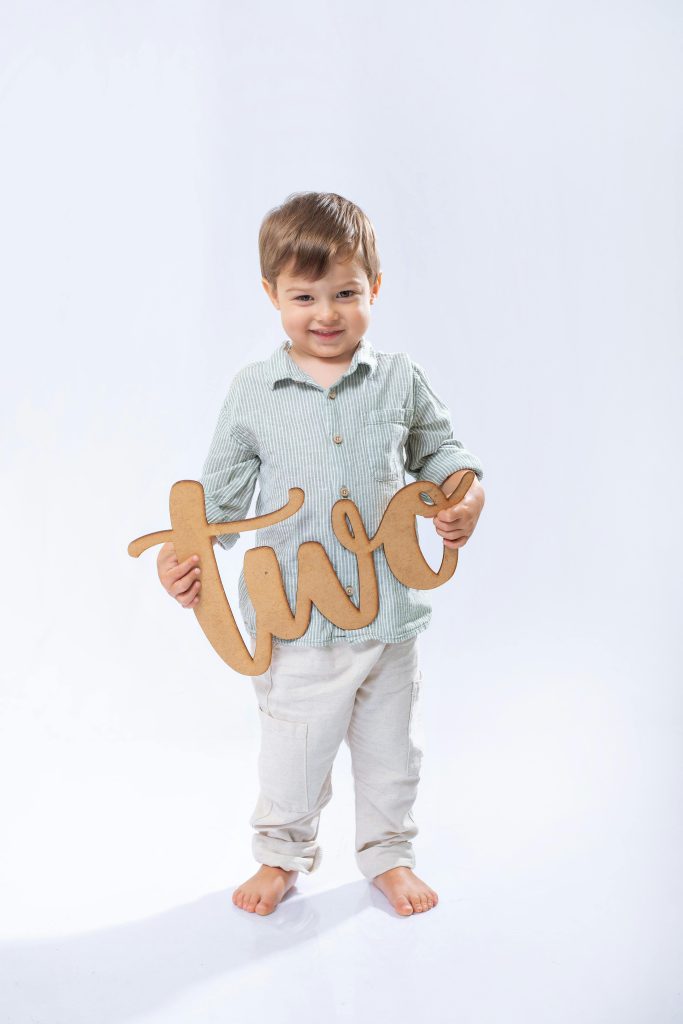 Adorable Toddler Holding A Wooden ‘two’ Sign, Smiling On A Bright Background.