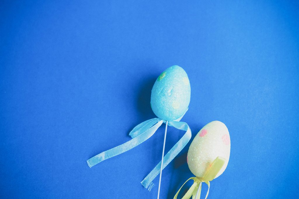 Decorative Easter Eggs With Ribbons On A Vibrant Blue Background.